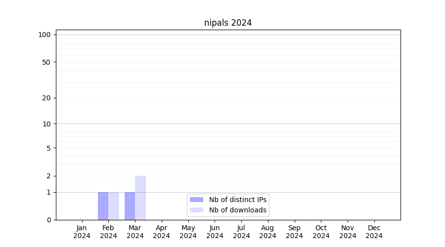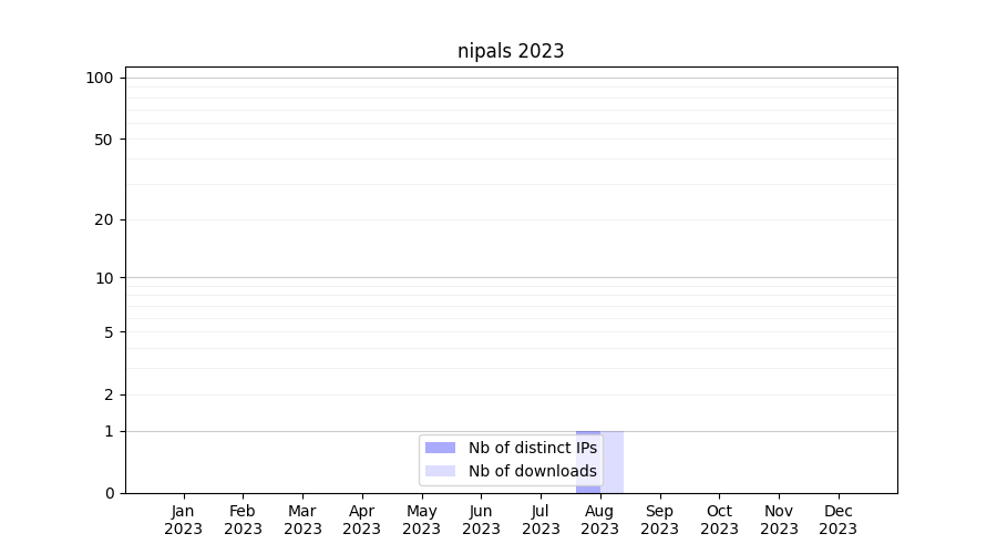 Number of downloads for annotation package nipals, year by year, from 2025 back to 2014 (years with no downloads are omitted):