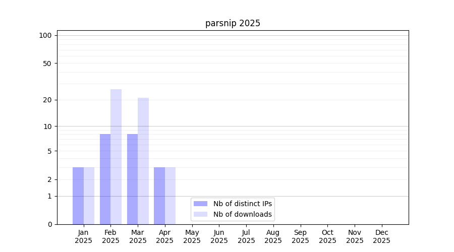 Number of downloads for annotation package parsnip, year by year, from 2025 back to 2014 (years with no downloads are omitted):