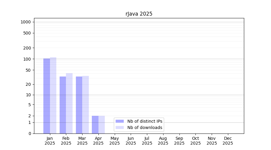 Number of downloads for annotation package rJava, year by year, from 2025 back to 2014 (years with no downloads are omitted):