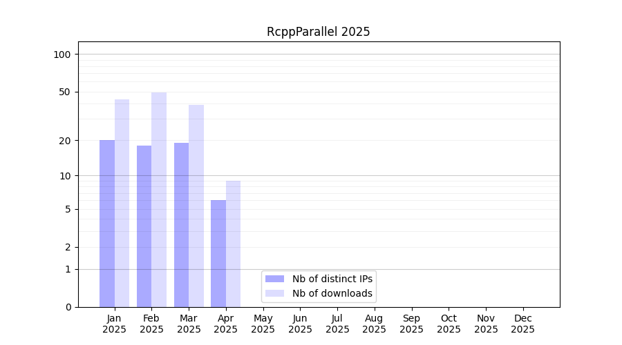 Number of downloads for workflow package RcppParallel, year by year, from 2025 back to 2015 (years with no downloads are omitted):