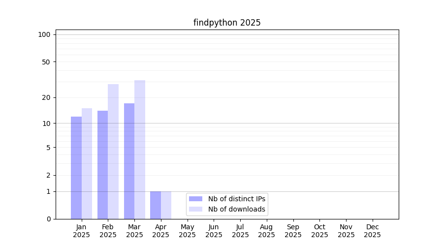 Number of downloads for workflow package findpython, year by year, from 2025 back to 2015 (years with no downloads are omitted):