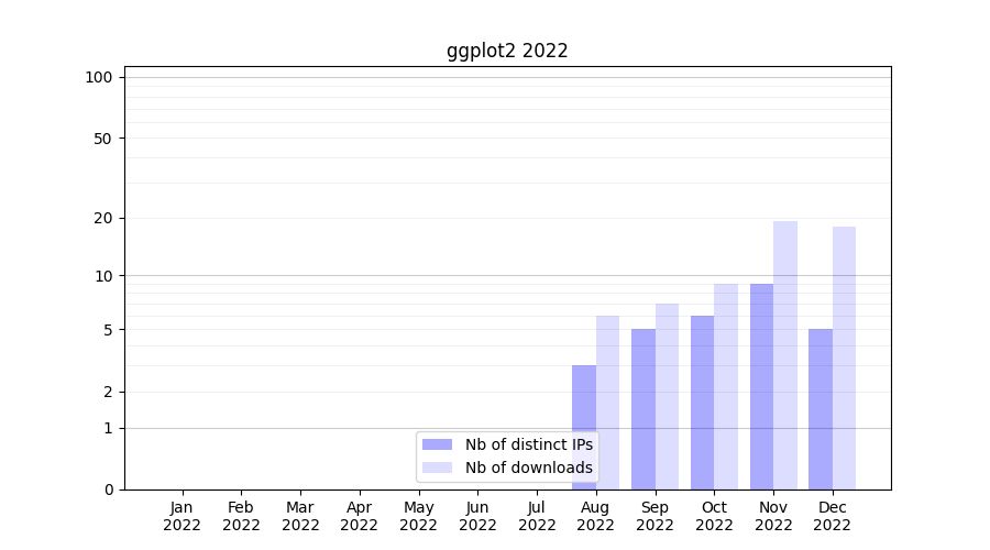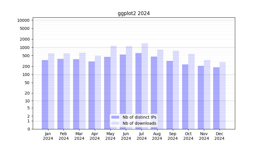 Number of downloads for workflow package ggplot2, year by year, from 2025 back to 2015 (years with no downloads are omitted):