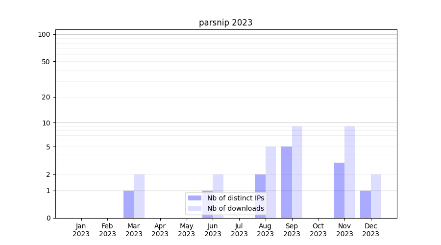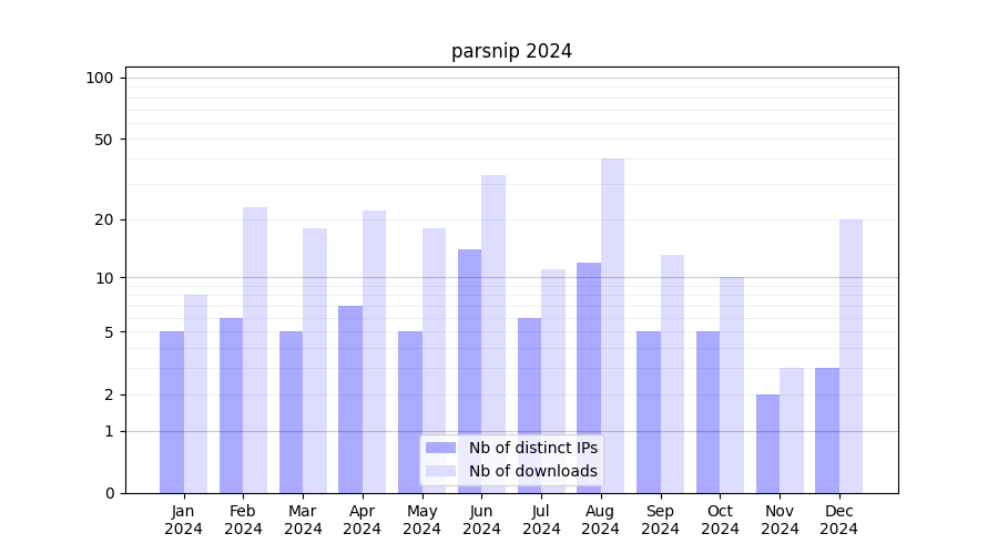 Number of downloads for workflow package parsnip, year by year, from 2025 back to 2015 (years with no downloads are omitted):