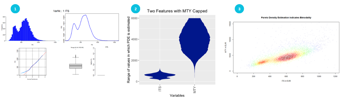 DensityScatter(ITS, MTY, xlab = 'ITS in EUR', ylab ='MTY in EUR', xlim = c(0,1200), ylim = c(0,15000), main='Pareto Density Estimation indicates Bimodality')