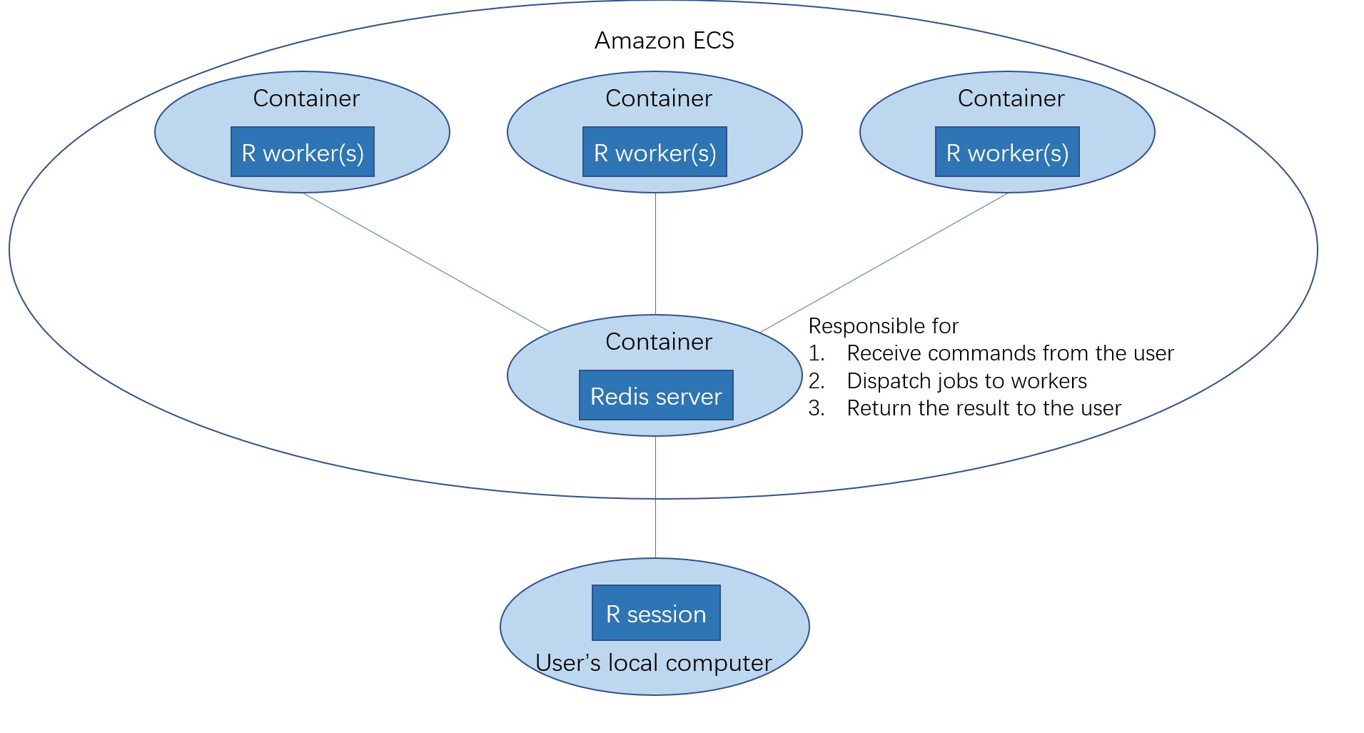 The cluster object is created in your local R session, but the workers and redis server are from Amazon ECS. Each docker container contains one or more R workers, they will receive jobs sent by your local R session and do the parallel computing.