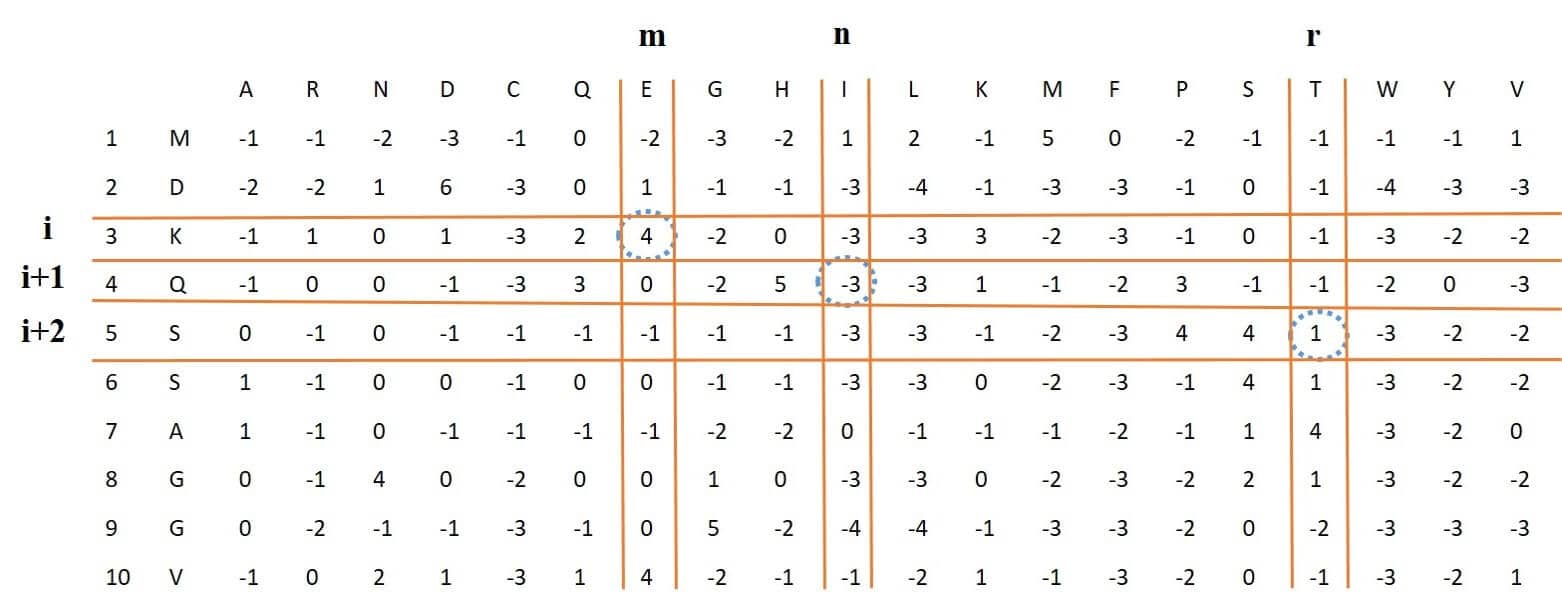 This feature vector is of length 8000, which is extracted from the PSSM. If we multiply elements available in three consecutive rows and three different columns of the PSSM by each other, and apply this to all rows (all three consecutive rows) and then sum these numbers, eventually one of the elements of feature vector with length 8000 corresponding to the three selected columns will be obtained. Because we have 20 different columns, The final feature vector will be of length 8000 = 20 * 20 * 20. Figure 4: shows these steps. For example, in this figure for three marked rows and columns, the numbers obtained from the intersection of these rows and columns marked with a blue dotted circle around them, are multiplied to each other.