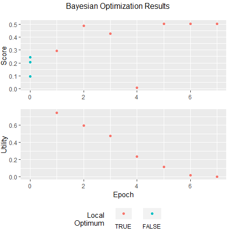 As you thoroughly explore the parameter space, you reduce the uncertainty in the unexplored areas. As you reduce uncertainty, you tend to reduce utility, which can be thought of as the potential to find a better parameter set than the one you already have. Notice that the expected improvement converged to 0 after iteration 5. If you see a similar pattern, you can be fairly certain that you have found an (approximately) global optimum.
