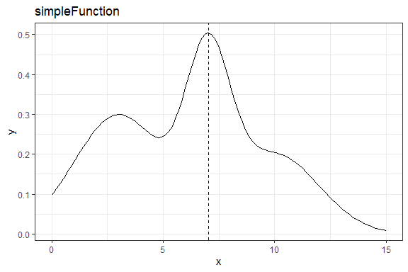 <- optim(8,simpleFunction,method = "L-BFGS-B",lower = 0, upper = 15,control = list(fnscale = -1))$par