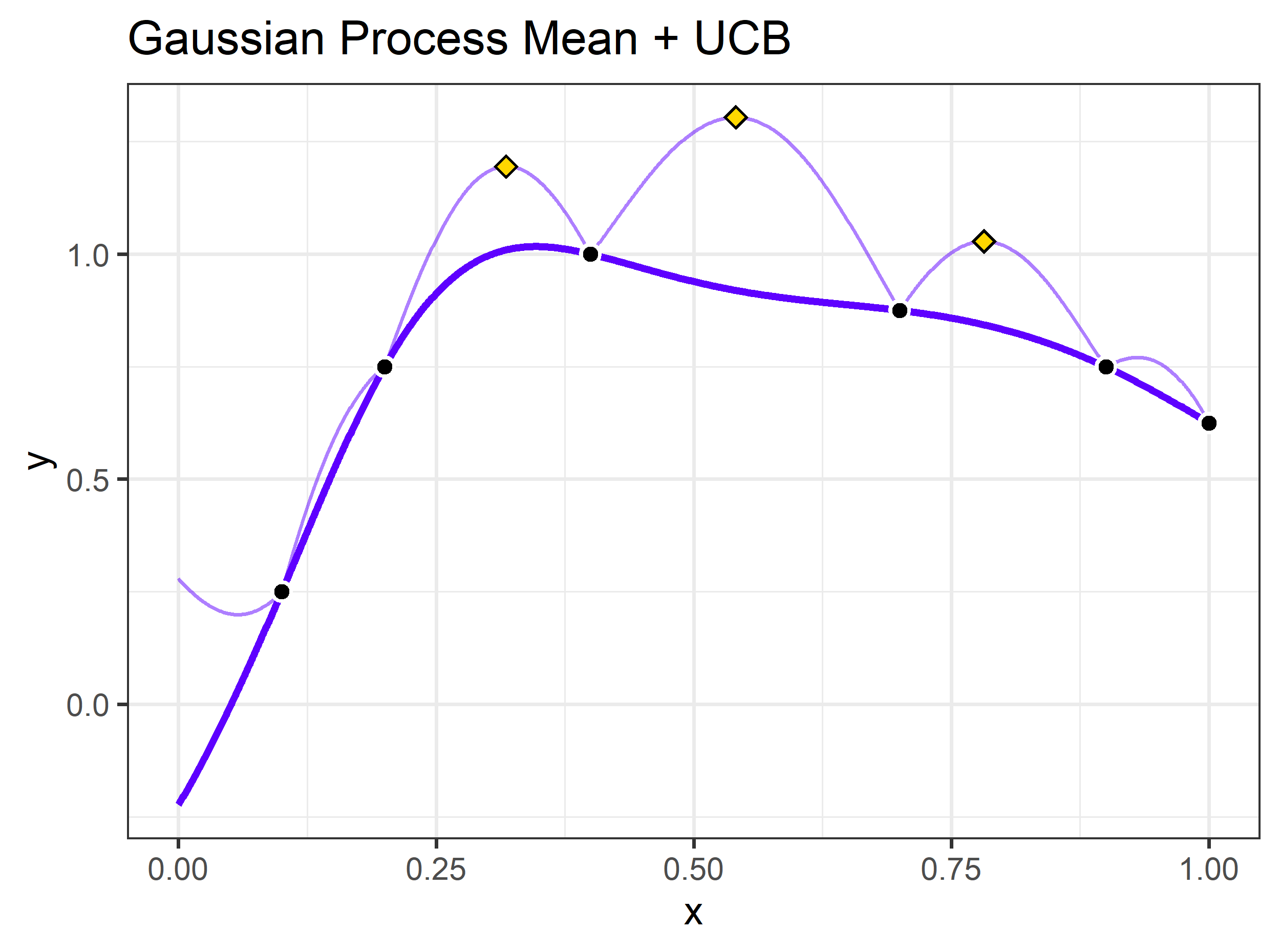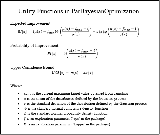 Before we can select our next candidate parameter to run the scoring function on, we need to determine how we define a “good” parameter inside this prior distribution. This is done by maximizing different acquisition functions within the Gaussian process. The acquisition function tells is how much utility there is at a certain unexplored space. In the chart above, the lower 3 graphs show examples different acquisition functions.
