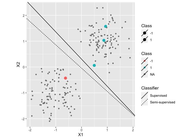 df ggplot(aes(x=X1,y=X2,color=Class,size=Class)) +