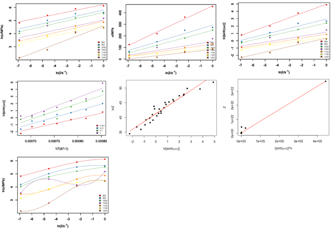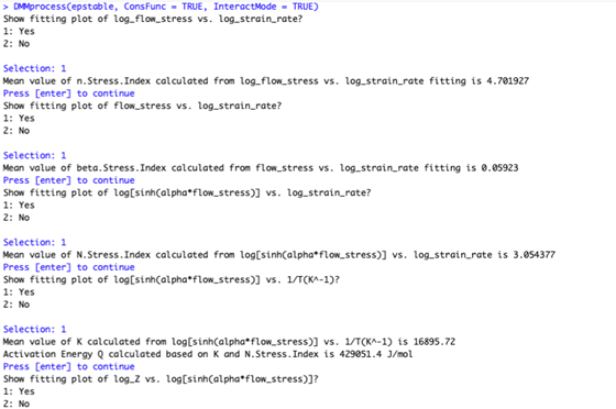 The function used to build dynamic material model (DMM) for materials is DMMprocess(). This function has two most important arguments: InteractMode and ConsFun. The argument InteractMode control the output of figures and parameters computed for DMM. If the value of ConsFun is TRUE``, the constitutive equation will be calculated then printed out. Additionally, if its value ofInteractModeis set asTRUE``` simultaneously, the following figures can be exported one by one: