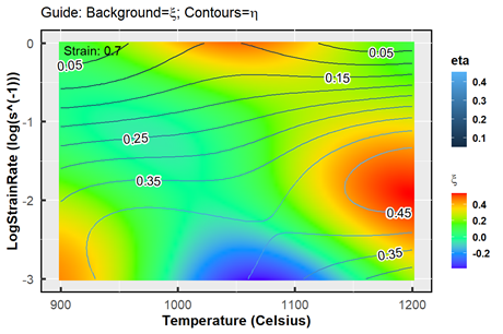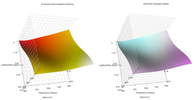 The phenomenon of adiabatic temperature rise non-negligible, especially in the conditions of low temperatures, high strain rates, or even both. Rationally, before the calculation for the processing maps, adiabatic heating correction should be utilized. The function TCorrect() can implement the automatic correction for this phenomenon. The corrected results will be: