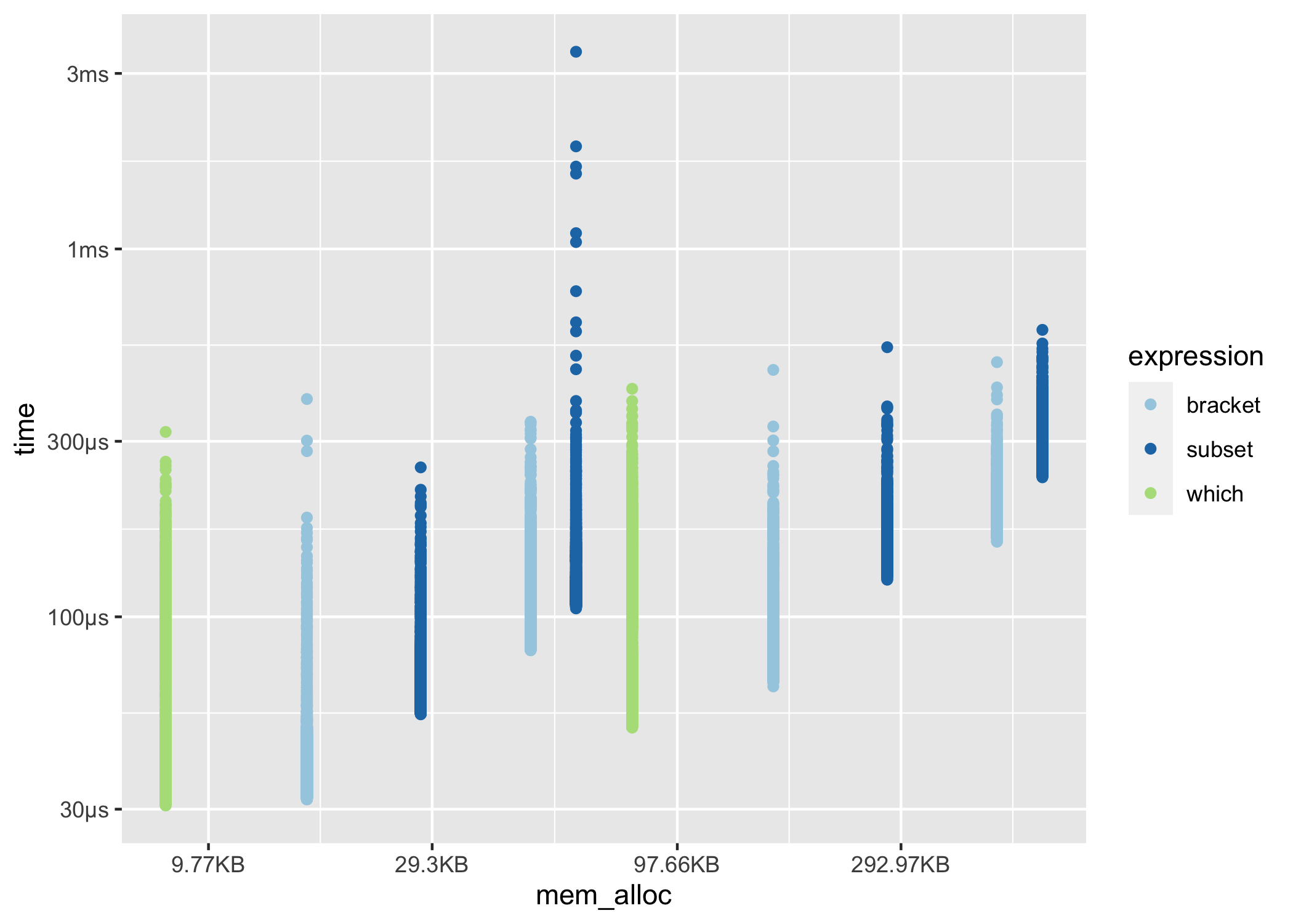 #> 2 dat[which(dat$x > 500), ] 124µs 168µs 6169. 260KB 33.2