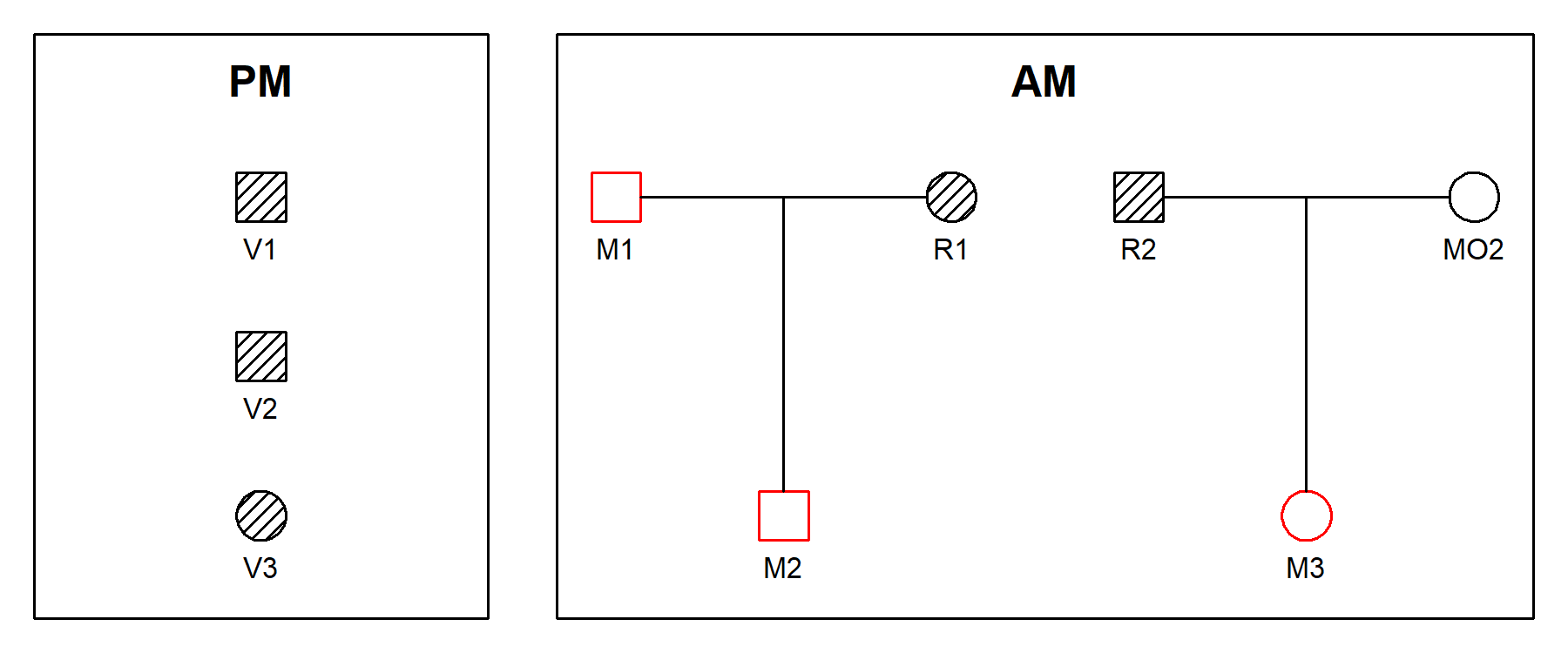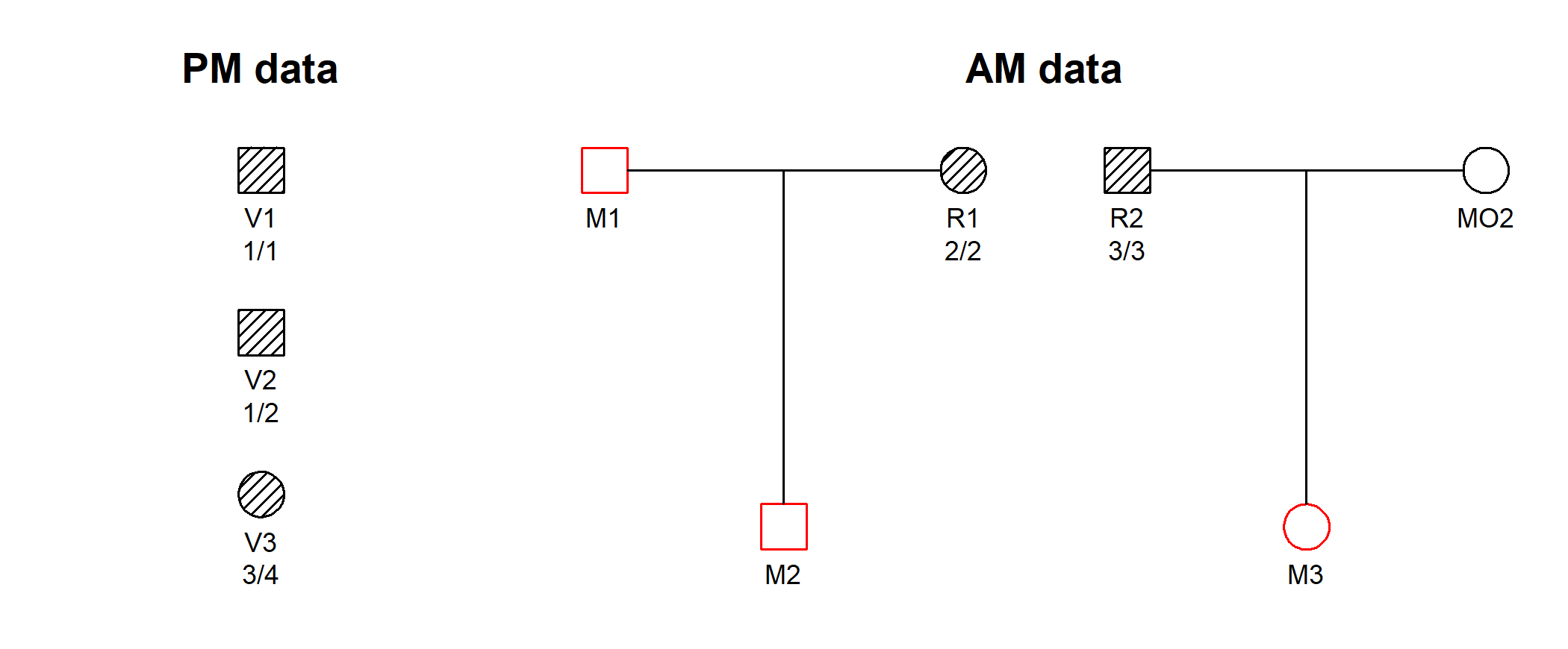 DNA profiles from victims are generally referred to as post mortem (PM) data, while the ante mortem (AM) data contains profiles from the reference individuals R1 and R2.