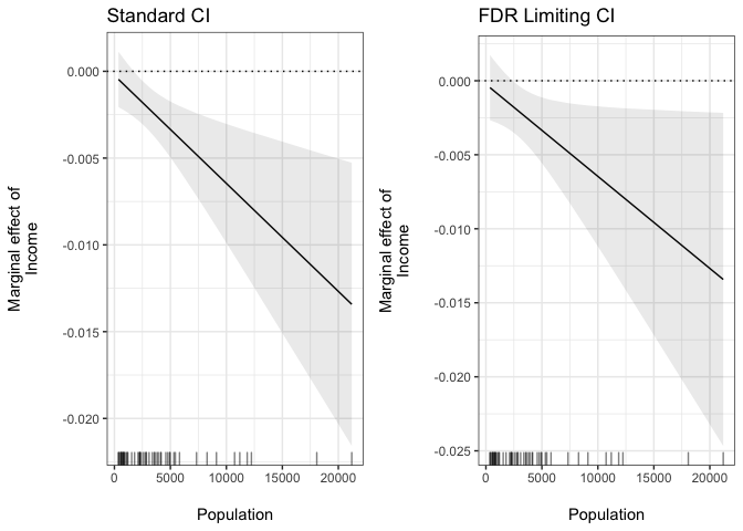 plot_me(m1, 'Income', 'Population', ci_type = 'fdr')Here is the result compared with standard confidence intervals: