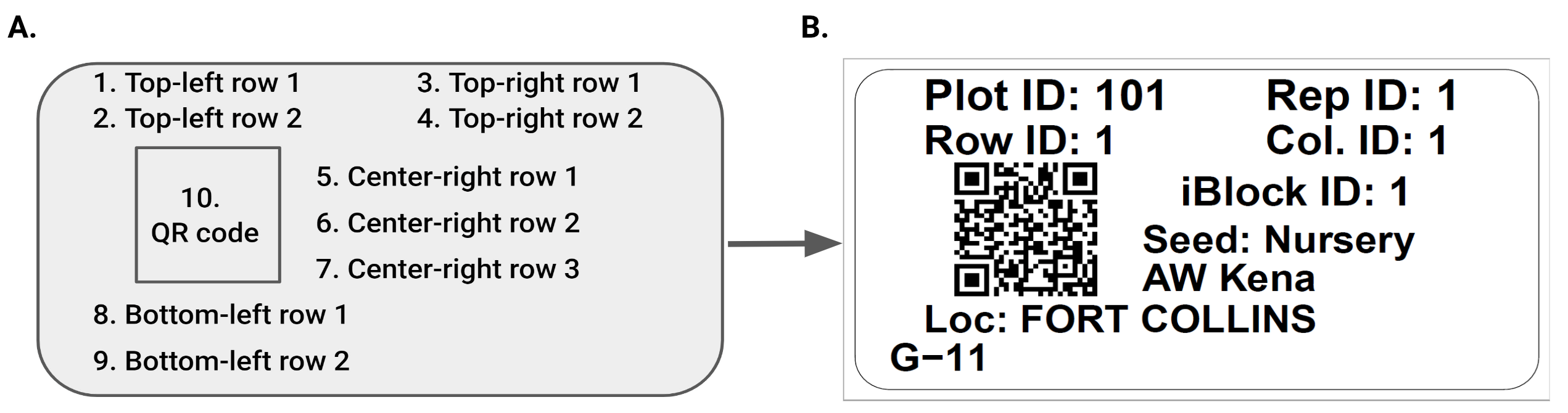 Fig. 1. Plot label design and content in qrlabelr for a landscape text orientation label format. A. There are nine (9) delineated text positions and 1 QR code position for any rectangular label (A). For a field plot label, the nine delineated text positions are mapped to specific human-readable texts by default as shown in B. |