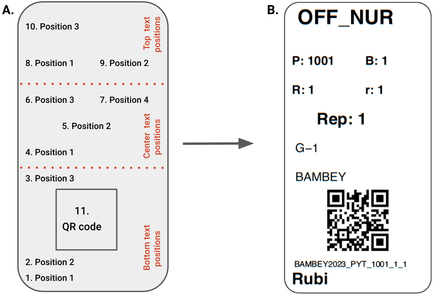 Fig. 2. Plot label design and content in qrlabelr for a portrait text orientation label format. A. There are ten (10) delineated text positions and 1 QR code position for any rectangular label with portrait text orientation. B. An example of a general-purpose label with a portrait text orientation. |