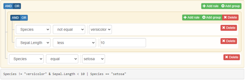 shinyQueryBuilder provides an input widget that allows to construct complex filtering queries in Shiny. It’s a wrapper for JS library jQuery-QueryBuilder.