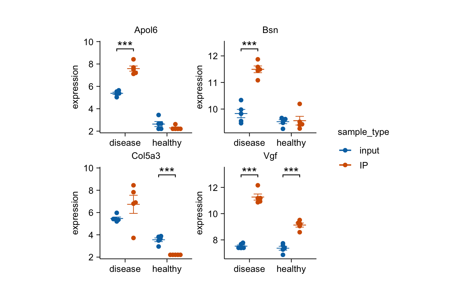 dplyrtidyplot(x = condition, y = expression, color = sample_type) |>