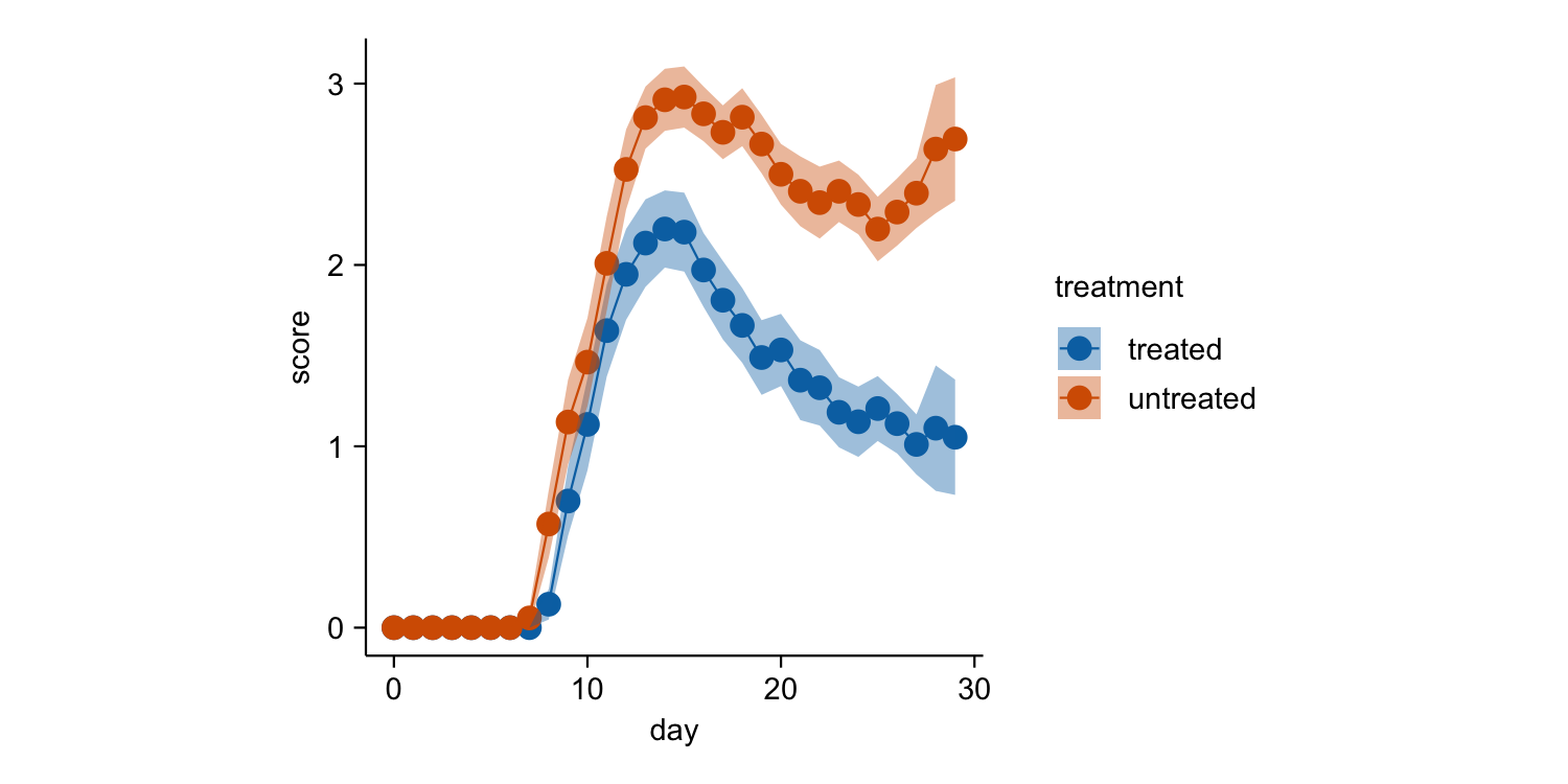 time_course tidyplot(x = day, y = score, color = treatment) |>